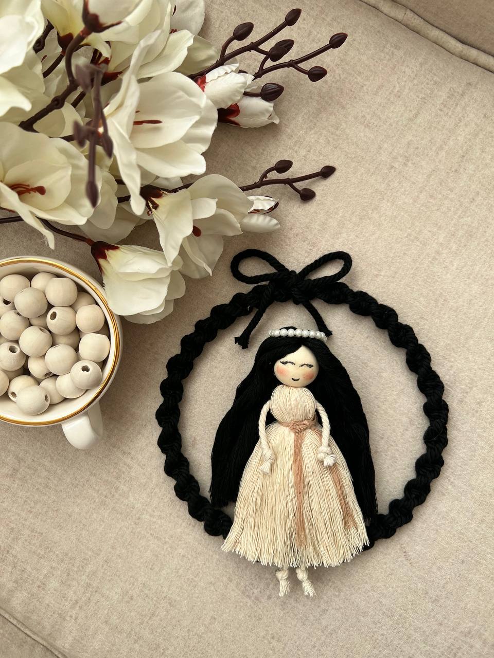 عروسک مکرومه حلقه دار رنگ مشکی شیری ابعاد ۲۰ سانت قطر کار رنگ قابل تغییر کد سفارش۱۶۶۴