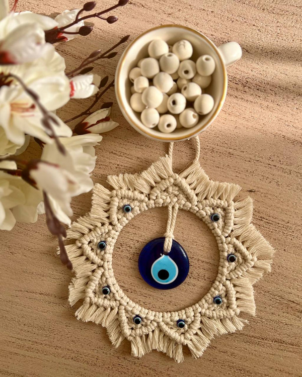 چشم نظر مکرومه طرح خورشید رنگ شیری ابعاد ۲۰ سانت کد سفارش۲۷۵