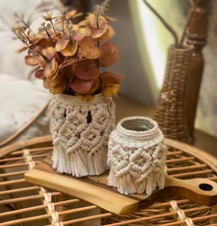 گلدان مکرومه طرح لوزی ابعاد ۱۷سانت رنگ‌شیری و قابل تغییر کد سفارش۱۵۴