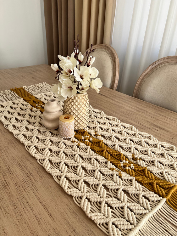 رانر مکرومه طرح گلبرگ رنگ شیری خردلی ابعاد ۳۰ در ۸۰ رنگ قابل تغییر کد سفارش۲۵۳۴