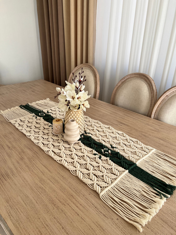 رانر مکرومه طرح گلبرگ رنگ سبز شیری ابعاد ۸۰ در ۳۰کد سفارش۵۷۷