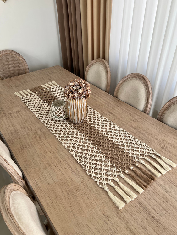 رومیزی و رانر مکرومه دورنگ مهره دار شیری و نسکافه ای در رنگ و طرح به دلخواه شما