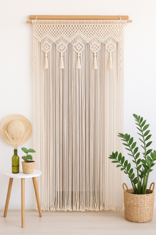 پرده مکرومه منگوله داررنگ شیری ابعاد دلخواه رنگ دلخواه شما کد ۱۰۷
